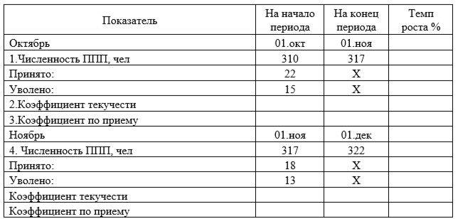 Определить численность ППП на конец октября и ноябрь месяцев, среднесписочную численность за эти месяцы, определить коэффициент текучести и коэффициент по приему за октябрь и ноябрь месяцы.