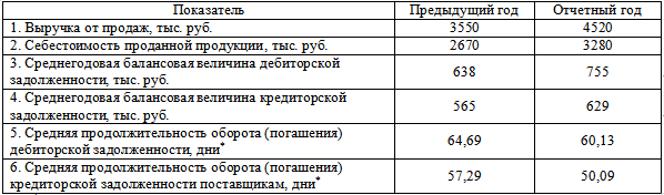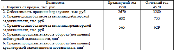 «По приведенным в таблице данным рассчитать среднюю продолжительность оборота (периода погашения) дебиторской задолженности и кредиторской задолженности поставщикам в отчетном и базисном годах (в днях).»