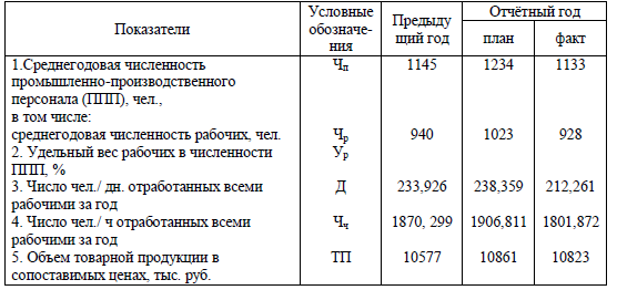 «Рассчитать влияние изменения использования рабочего времени на выпуск товарной продукции: а) приемом цепных подстановок численности рабочих; числа дней, отработанных одним рабочим; продолжительности рабочего дня; среднечасовой выработки.»