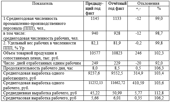 Рассчитать влияние изменения использования рабочего времени на выпуск товарной продукции: а) приемом цепных подстановок численности рабочих; числа дней, отработанных одним рабочим; продолжительности рабочего дня; среднечасовой выработки.