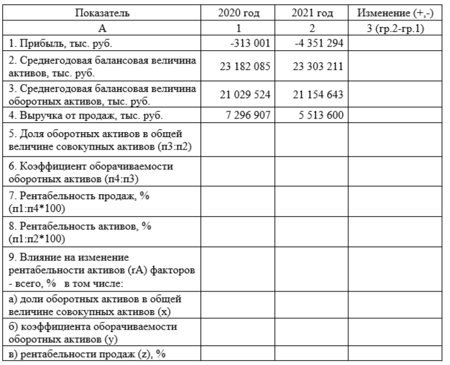Определить влияние на изменение рентабельности активов следующих факторов: рентабельности продаж; оборачиваемости оборотных активов; доли оборотных активов в общей величине совокупных активов.