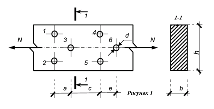 1. Определить несущую способность центрально-растянутого деревянного элемента (рисунок 1) сечением b x h, ослабленного шестью отверстиями, выходящими на пласть, диаметром d с исходными данными.