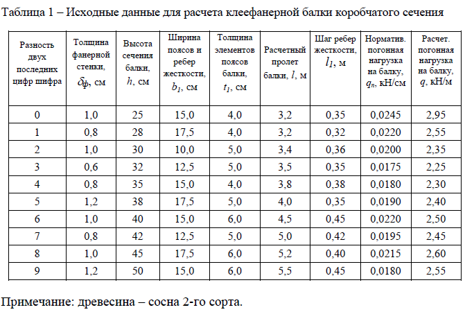 Проверить сечение клеефанерной коробчатой балки высотой h и расчетным пролетом l (рис. 1). Фанерные стенки балки выполнены из водостойкой клееной березовой фанеры марки ФСФ толщиной ф. Пояса выполнены из досок сечением b1× t1. Ребра жесткости балки устанавливаются с шагом l1 и имеют сечение b1×40 мм. Элементы балки изготовлены из древесины сосны 2-го сорта. На балку действует равномерно распределенная погонная нагрузка с нормативным значением qn и расчетным значением q. Исходные данные для расчета балки приведены в табл. 1.