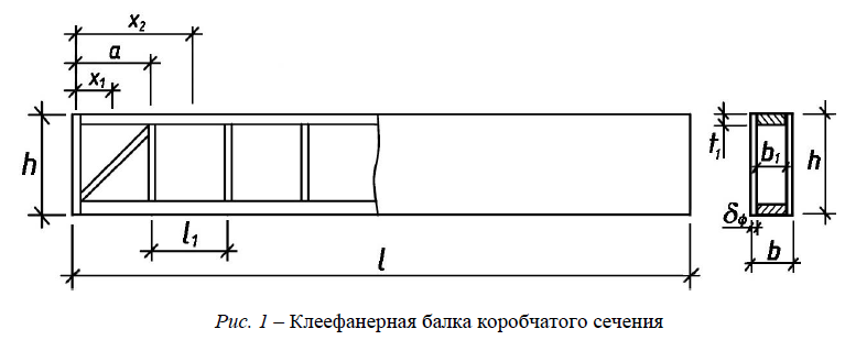 «Проверить сечение клеефанерной коробчатой балки высотой h и расчетным пролетом l (рис. 1). Фанерные стенки балки выполнены из водостойкой клееной березовой фанеры марки ФСФ толщиной ф. Пояса выполнены из досок сечением b1× t1. Ребра жесткости балки»