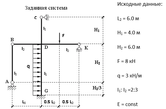 1. Определение степени кинематической неопределимости заданной рамы на рисунке.