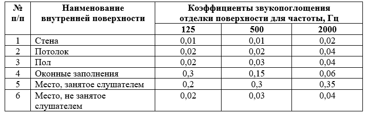 Коэффициенты звукопоглощения внутренних поверхностей зала для частот 125, 500 и 2000 Гц приведены в табл. 1.