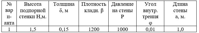 Для строительства объекта отрывается котлован глубиной (Н=1,5). Грунт неустойчив, поэтому устраивается подпорная стенка толщиной (δ=0,15) в кирпичном или бетонном исполнении плотностью (ρ=1200), выполнена подпорная стенка длиной (а=1). Определить устойчивость стенки.