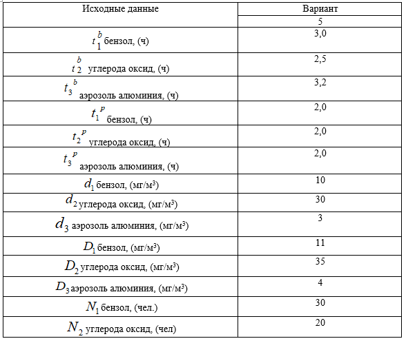 Дать количественную оценку потенциальной вредности производственного процесса, при котором в воздух рабочей зоны выделяются бензол, углерода оксид и аэрозоль алюминия. Продолжительность рабочей смены Тсм (ч). Время действия вредного фактора tbj (ч). Время нахождения человека в зоне действия вредности в течение рабочей смены tpj (ч). Фактическое содержание j–го вредного вещества dj (мг/м3). Предельное содержание j–го вредного вещества Dj (мг/м3). Количество работающих в зоне действия вредных факторов Nm (чел). Количество работающих, не подвергающихся действию вредных факторов Nb (чел). Общая численность работающих N (чел).