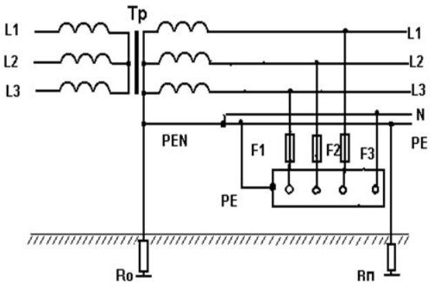 1. Выбираем систему питающей сети, TN-C-S. Принципиальная схема, которой должна содержать электроустановку, плавкие предохранители, зануление, повторное заземление нулевого защитного проводника.