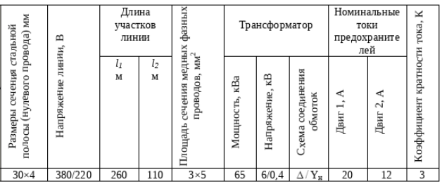 Проверить, обеспечена ли отключающая способность зануления в сети, (рис. 2, исходные данные к решению задачи принять по таблице 3), при нулевом защитном проводнике стальной полосе сечением 30×4 мм. Линия 380/220 В с медными проводами 3×25 мм2 питается от трансформатора 65 кВА, 6/0.4 кВ со схемой соединения обмоток «треугольник звезда с нулевым проводом» (Δ YH). Двигатели защищены предохранителями IIном = 20 А (двигатель 1) и I2ном = 12 А (двигатель 2). Коэффициент кратности тока К=3.