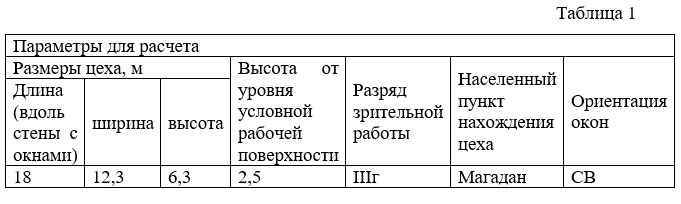 «Рассчитать площадь световых проемов в цехе для обеспечения нормированного значения коэффициента естественного освещения (КЕО). Для расчета естественного освещения принять боковое расположение световых проемов»