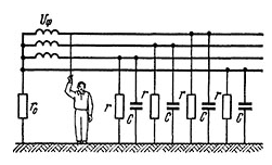 Рис. 1. Прикосновение человека к фазному проводу трехфазной четырехпроводной сети с заземленной нейтралью при нормальном режиме