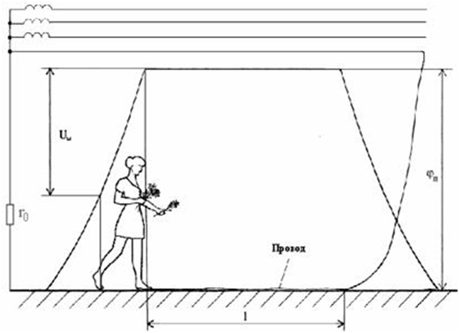 Вблизи упавшего провода потенциалы поверхности земли изменяются, как показано на рисунке.