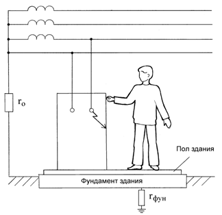 Сотрудник офиса коснулся корпуса холодильника, который в результате неисправности оказался электрически связанным с питающим фазным проводом.
