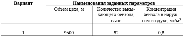 В малярном цехе применяются краски на основе бензола. В результате высыхания краски в воздух ежечасно поступает указанное в таблице количество бензола.
