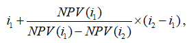 Внутренняя норма доходности (IRR) это такая ставка дисконтирования, при которой чистая текущая стоимость проекта равна нулю. Внутренняя норма доходности характеризует верхний уровень затрат по проекту. Рассчитывается с применением метода интерполяции (подбора) по формуле: