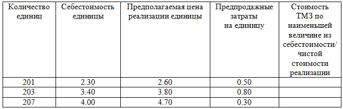 Корпорация «МММ» оценивает ТМЗ по наименьшей величине из себестоимости и чистой стоимости реализации. Определить стоимость ТМЗ и записать ее в таблице.