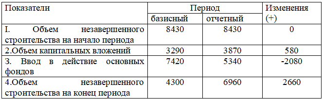 «Определить объем незавершенного строительства на конец периода. Установить изменение объема незавершенного строительства, дать оценку влияния изменения незавершенного строительства на выполнение ввода в действие основных фондов»