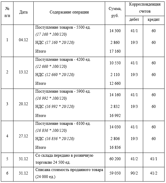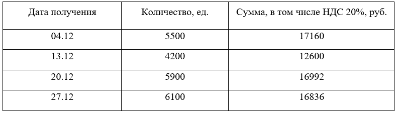 «По данным бухгалтерского учета на 1 декабря в учете торговой организации числилось 3600 единиц товара на сумму 9 000 руб. За месяц от поставщиков было получено 4 партии такого же товара. График поставок приведен в таблице. Весь товар оплачен.»