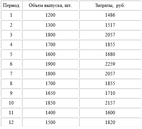 Из всей совокупности данных выбираются два периода с наибольшим и наименьшим объемом производства. В нашем примере это 6 и 1 (1900 и 1200 шт.).
