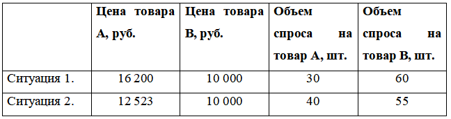 Используя данные приведенные в таблице 3.3, рассчитайте дуговой коэффициент прямой эластичности спроса по цене на товар А и перекрестной эластичности спроса – на товар В. Таблица 3.3