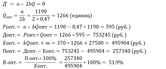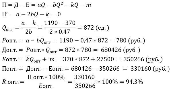 Определить оптимальный объем выпуска предприятием и оптимальную цену единицы продукции, используя следующие критерии оптимальности: - максимум абсолютной величины доходов; - максимум абсолютной величины прибыли; - максимум рентабельности. Для каждого