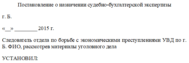 - составить постановление на проведение бухгалтерской экспертизы и необходимые вопросы;
