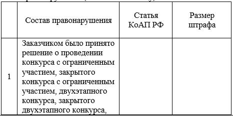 «Определите статью КоАП РФ и размер штрафа за приведенные ниже правонарушения (заполните таблицу): Заказчиком было принято решение о проведении конкурса с ограниченным участием»