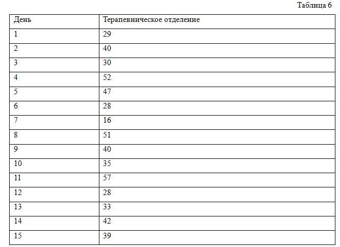 Имеются данные за пятнадцать дней по количеству пациентов клиники, прошедших через соответствующие отделения в течение дня. Данные приведены в табл. 6.