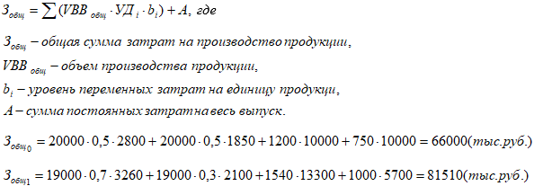 Таким образом наблюдается снижение общей суммы затрат на 81510 66000 = 15510 (тыс.руб.). Выясним какие факторы оказали влияние на изменение данной суммы, а также определим размер влияния каждого фактора на изменение величины общей суммы затрат на производство продукции. Расчет будем вести методом цепных подстановок.