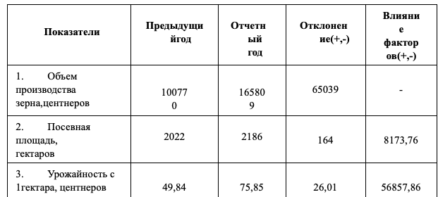«Определите, используя способ «абсолютных разниц», изменение объема производства зерна. Проанализируйте экстенсивное и интенсивное влияние факторов на объем производства, оцените полученные результаты и сделайте выводы.»