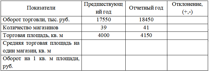 «Произвести факторный анализ оборота розничной торговли по району. В процессе анализа определить влияние изменения: количества магазинов, средней торговой площади на один магазин, оборота на 1 кв. м торговой площади.»