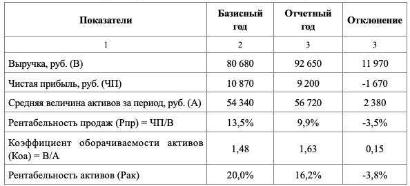 Задание На основании исходных данных таблицы определить величину влияния на рентабельность активов рентабельности продаж и оборачиваемости активов методом относительных разниц на основе модели: где Рак – рентабельность активов, ЧП – чистая прибыль за