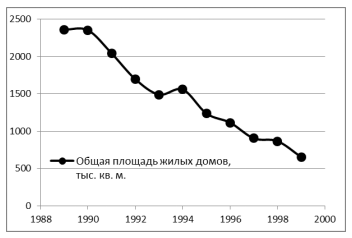 По диаграмме прослеживается убывающий тренд в объеме ввода в действие площади жилых домов в наблюдаемом периоде (1998-2000 г.г.).