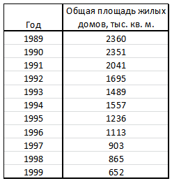 Имеются данные о размере ввода в действие общей площади жилых домов в городе за 1989-1999 гг., тыс. м2.
