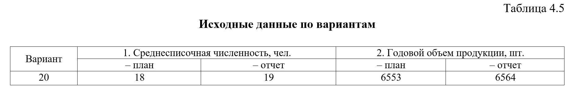 Рассчитать производительность труда по плану и отчету, определить абсолютное и относительное изменение. Данные для расчетов представлены в табл. 4.5. Результаты расчетов представить в табл. 4.6. Плановый годовой фонд рабочего времени принять равным 250 рабочих дней (8-часовая рабочая смена, 1 смена в день). Сделать выводы об изменении показателей.