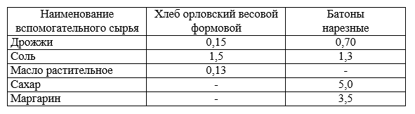 Норма расхода вспомогательного сырья (в кг на центнер муки) содержатся в таблице:
