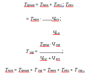 Трудоемкость технологическая представляет собой затраты времени основных рабочих на производство продукции. Соответственно трудоемкость обслуживания – затраты времени вспомогательных рабочих, трудоемкость управления – затраты времени руководителей и специалистов. Между ними существует следующая взаимосвязь: