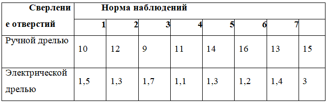В результате проведенного хронометража установлены следующие затраты времени (в мин.) на выполнение операции «сверление отверстий» ручной и электрической дрелью (табл. 10).