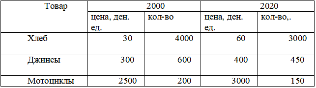 Данные таблицы 1.1 дают представление об экономике условной страны, производящей только 3 вида товаров. В качестве базового года выбран 2000 год.