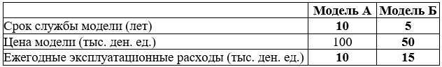 Для Вашего проекта «Свежая вода» необходима регенерирующая установка. На рынке существуют две модели установок — модель А и модель Б. Необходимая сравнительная информация представлена в следующей таблице: