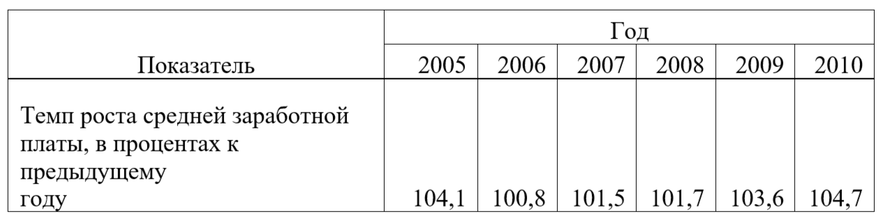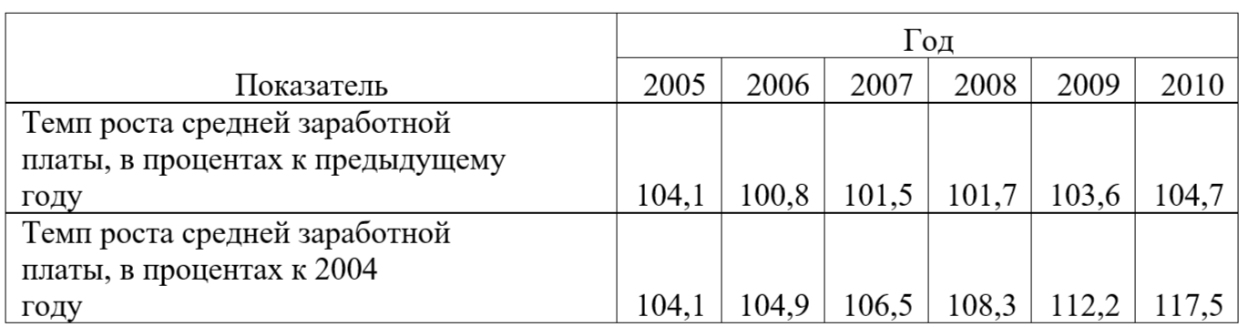 Темпы роста средней заработной платы за каждый год по сравнению с 2004 годом определим как произведение предыдущих цепных индексов. Расчет представим в таблице: