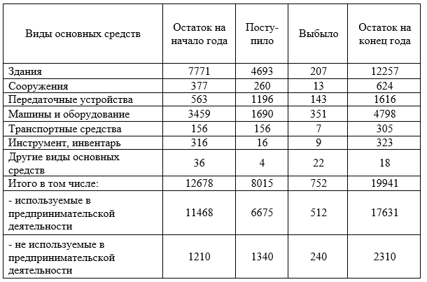 Таблица 2.11 – Состав и движение основных средств в отчетном году в тыс. руб.