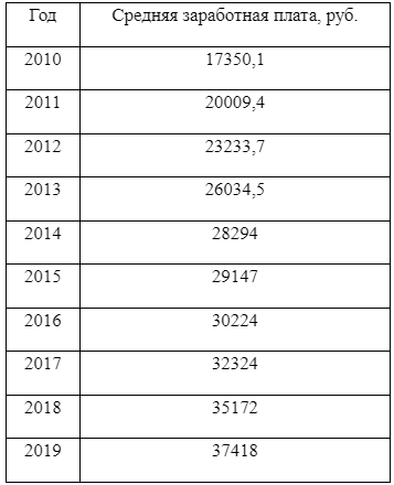 Таблица 1. Средняя заработная плата в Республике Татарстан за 2010-2019 гг.