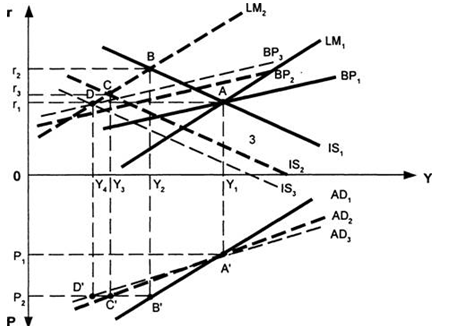Построение кривой совокупного спроса при плавающем валютном курсе осложняется тем, что на изменение цен реагирует помимо множества других параметров и валютный курс. Начиная, как и прежде, с точки макроэкономического равновесия А, в модели определяется точка A' кривой совокупного спроса (рис.).
