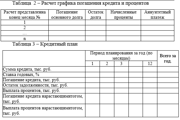 Научиться составлять кредитный план в рамках финансового плана бизнес-плана. В соответствии вариантом необходимо составить кредитный план и сформировать график погашения кредита аннуитетным платежом в таблицах 2 и 3. Таблицу 2 также необходимо привести в файле Excel для проверки расчетов.