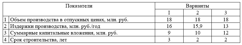 «Определить наиболее экономичный вариант строительства завода. Объем производства в отпускных ценах в первом варианте восемнадцать млн руб., во втором восемнадцать млн руб., в третьем восемнадцать млн руб.»