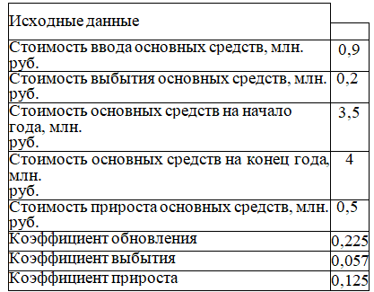 «Определить пропущенные показатели движения основных средств: Исходные данные Стоимость ввода основных средств, млн. руб. 0,9 Стоимость выбытия основных средств, млн. руб. 0,2 Стоимость основных средств на начало года, млн. руб. 3,5»