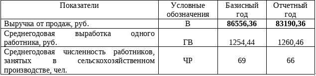 «Определите влияние выручки от продаж продукции и среднегодовой численности работников, занятых в сельхозпроизводстве, на среднегодовую выработку одного работника с помощью метода цепных подстановок.»