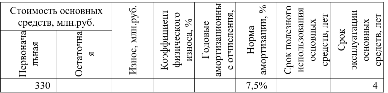 «(Основные средства) Стоимость основных средств, млн.руб. Износ, млн.руб. Коэффициент физического износа, % Годовые амортизационные отчисления, млн.руб. Норма амортизации, % Срок полезного»